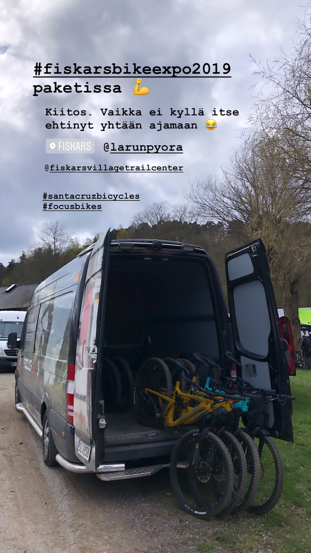 Hyvä kevään merkki maastopyöräilijöille on Fiskars Village Bike Expo, joka on Suomen suurin pyöräilymessu- ja demotapahtuma Fiskarsin ruukissa. Jos haluaa testata lukuisten pyörämerkkien tarjontaa maastossa, kannattaa unohtaa alkukevään GoExpo, käydä Don’t Go Expossa ja odottaa Fiskarsin maastoja. Tänä vuonna Fiskars Village Bike Expo järjestettiin lauantaina 4.5.2019 ja olin paikalla poikkeuksellisesti Larun pyörän pisteellä koeajattamassa Focuksen sähköpyöriä ja Santa Cruzin maastopyöriä. Tässä lyhyt raportti messujen tarjonnasta.