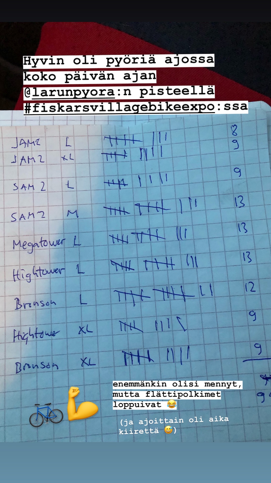 Päivän aikana Larun pyörän pisteellä kävi lähes 100 ajajaa testaamassa esitteillä olevia Santa Cruzin ja Focuksen pyöriä. Eri malleja ajettiin suurin piirtein yhtä paljon ja enemmänkin olisi pyöriä ollut varmaan ajossa, jos mukana olisi ollut kaikkiin pyöriin flättipolkimia. Santa Cruzin Hightower ja uutuus Megatower kiinnostivat eniten, kuten myös Focuksen M-koon SAM2 -sähköpyörä.