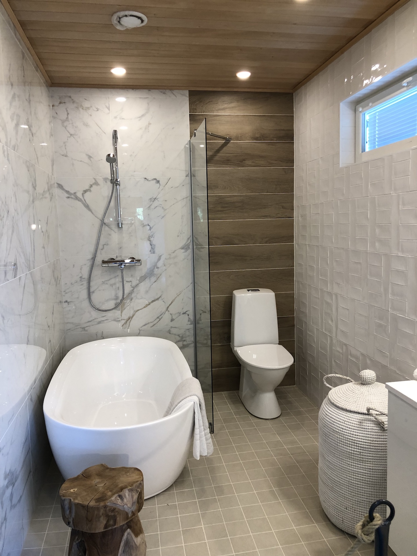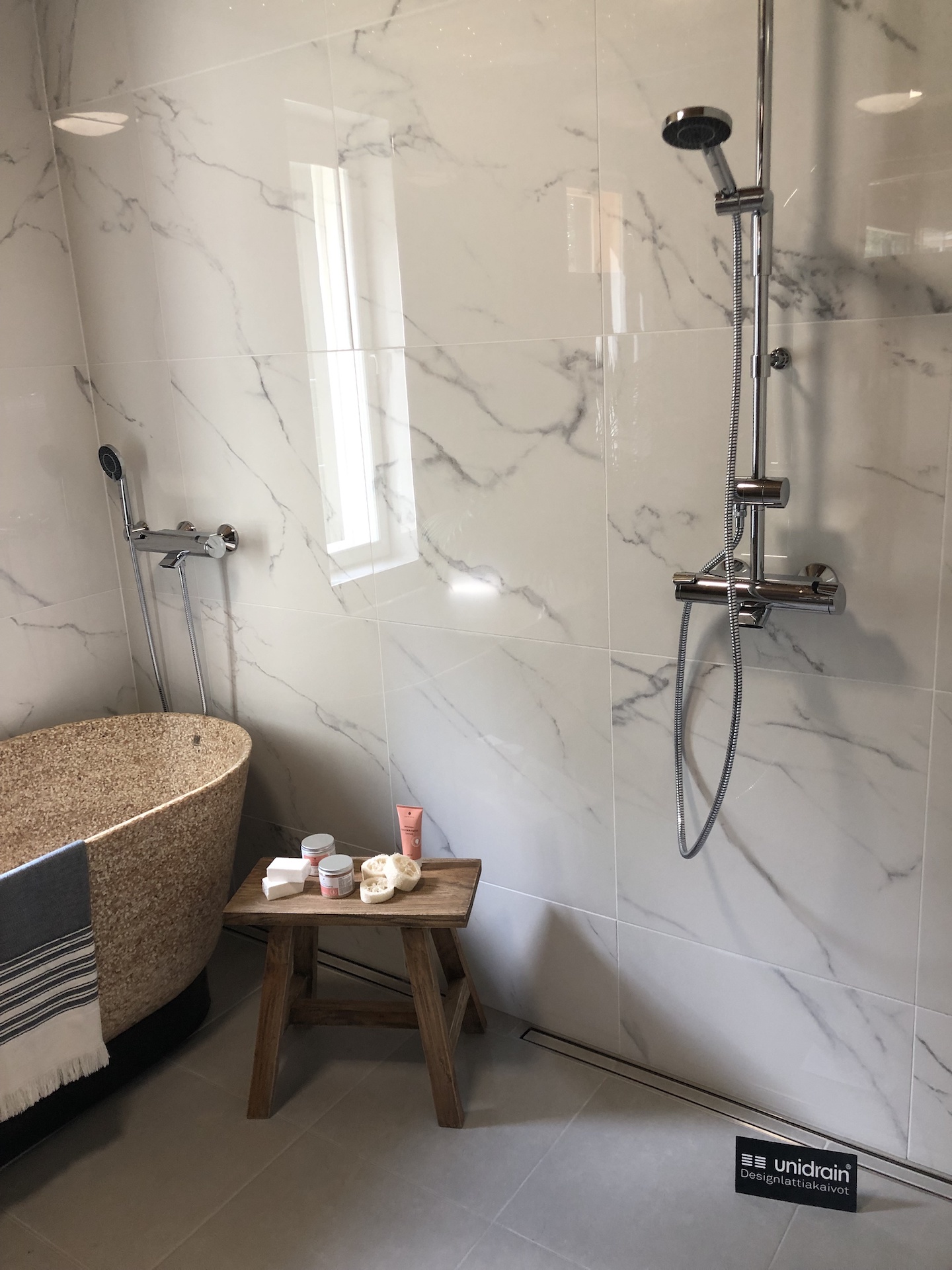 Kylpyhuoneessa oli viemäri toteutettu tyylikkäästi ja saunassa erikoisuutena valkoinen kiuas valkoisine kivineen. Lauderatkaisu oli hieman erilaisempi, joskin silti aika tylsän perinteinen.