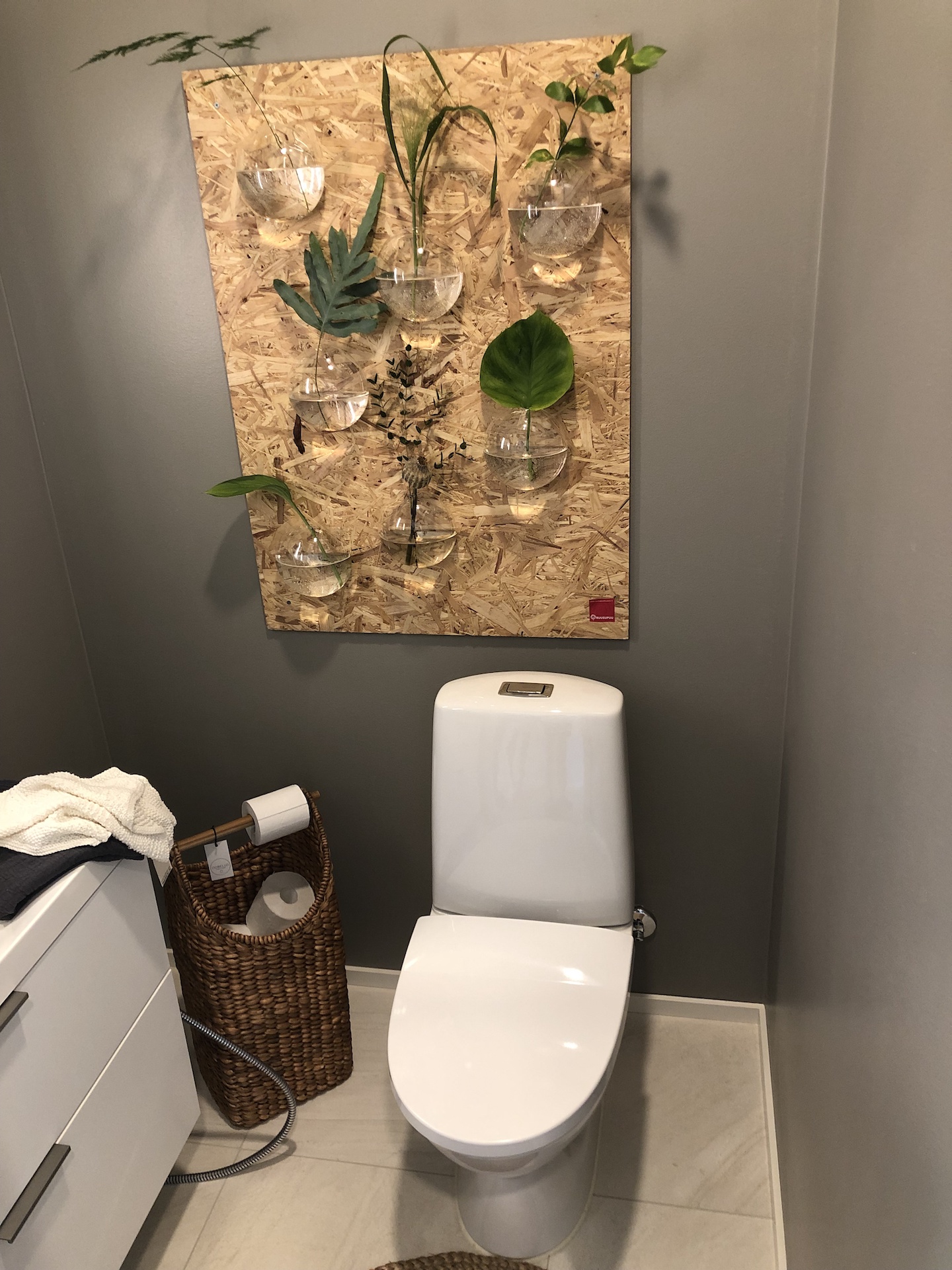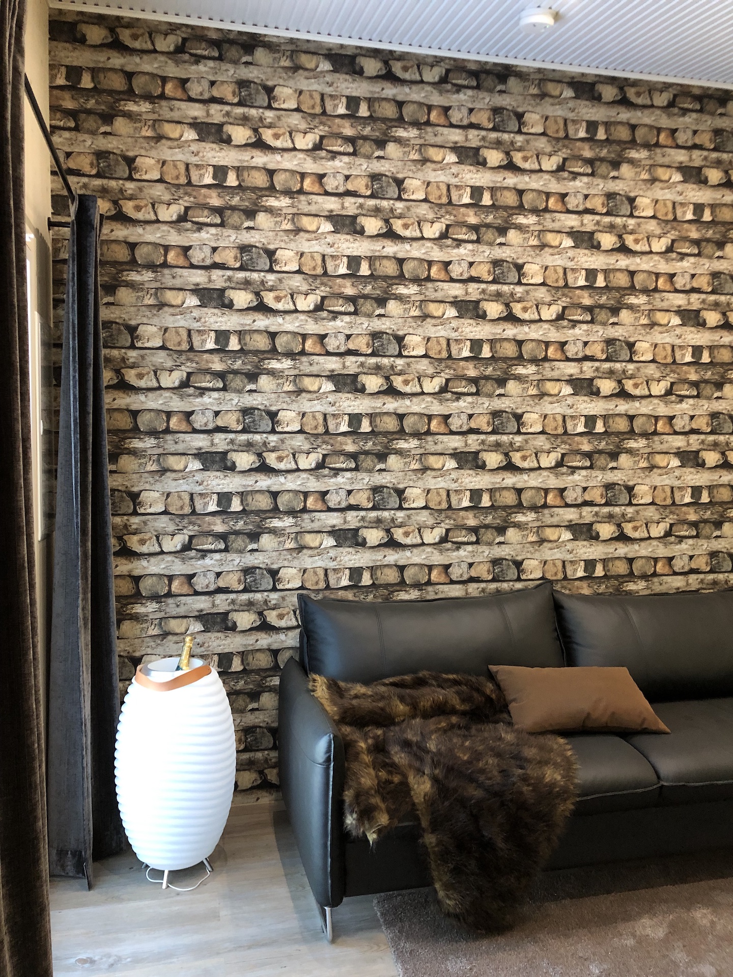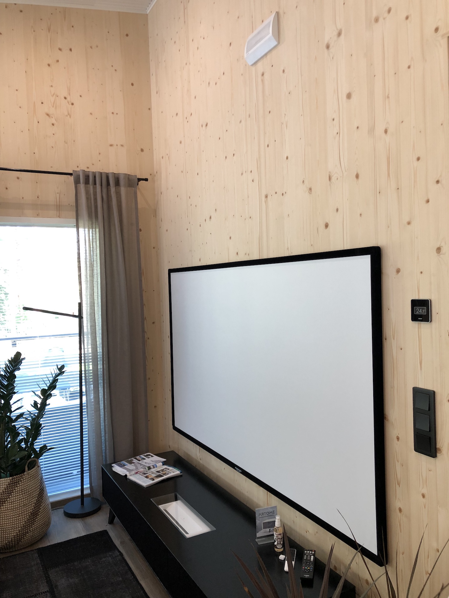 Tässä kohteessa vihreitä arvoja oli tosiaan ajateltu, sillä vain muutamassa seinässä oli tapetti ja muuten seinät olivat ilmeisesti paljasta puuta, niihin ei saanut koskea. Villa Element oli harvoja asuntoja, joista löytyi selkeä paikka televisiolle ja jopa asennettu valkokangas.