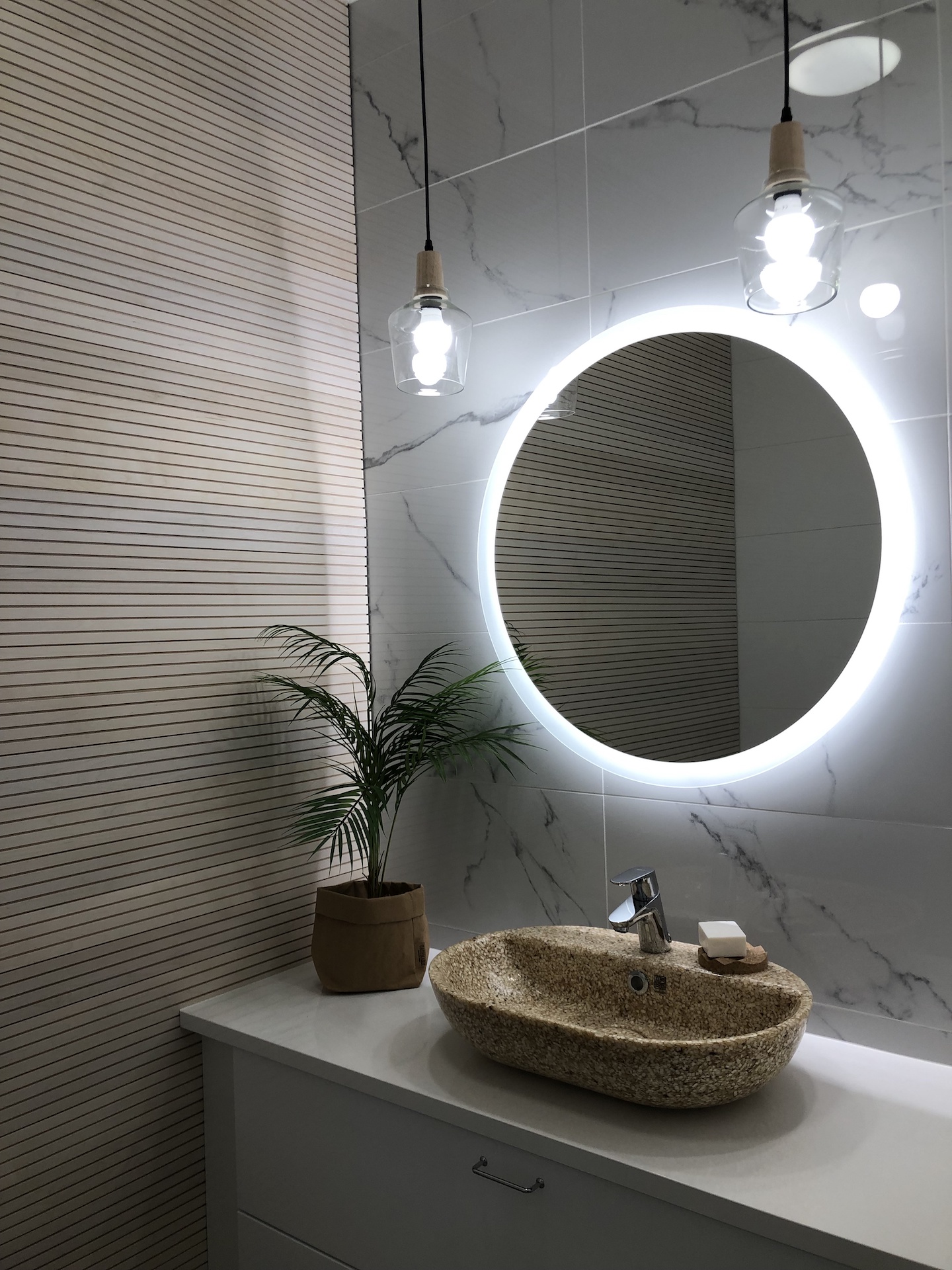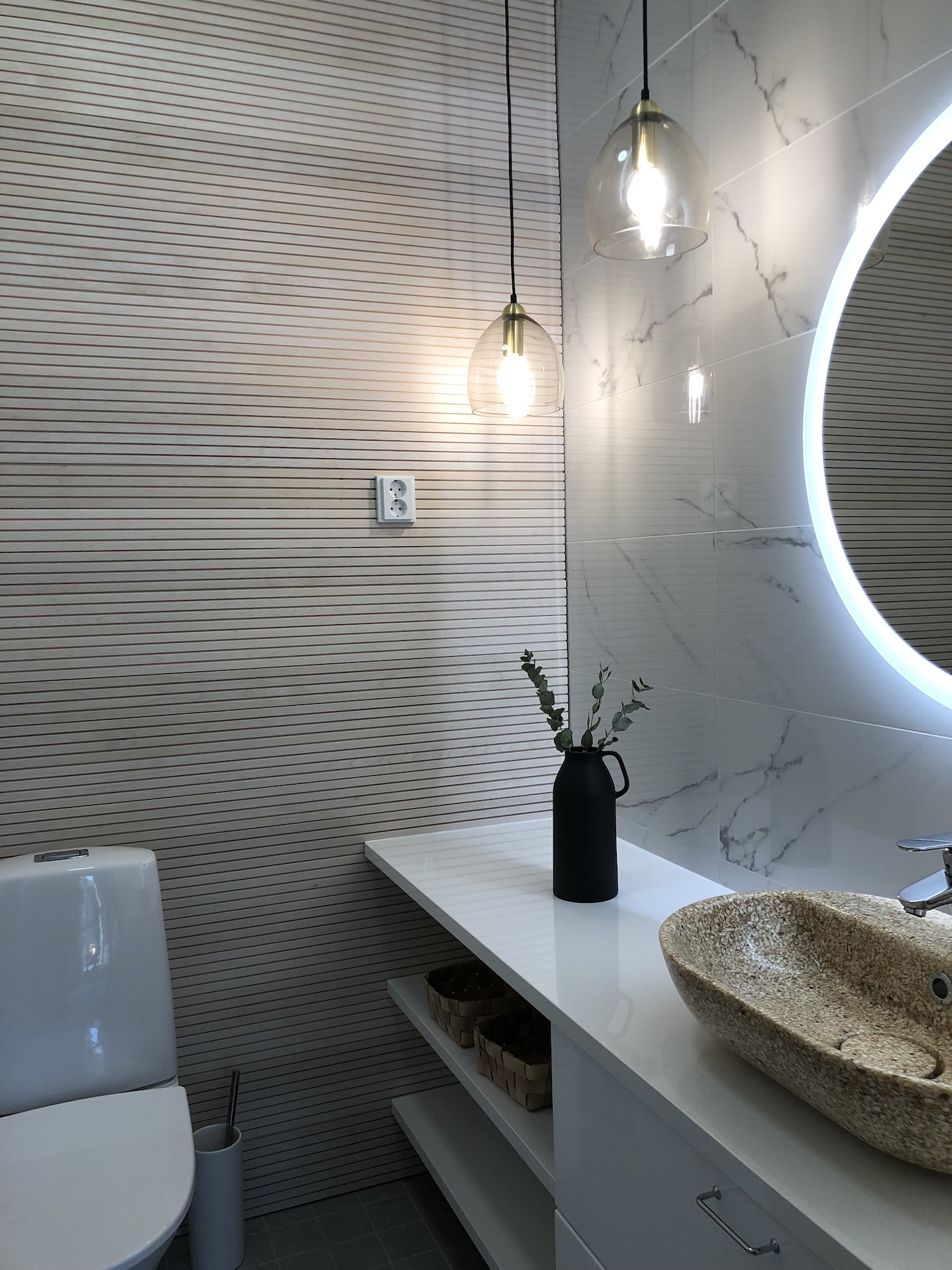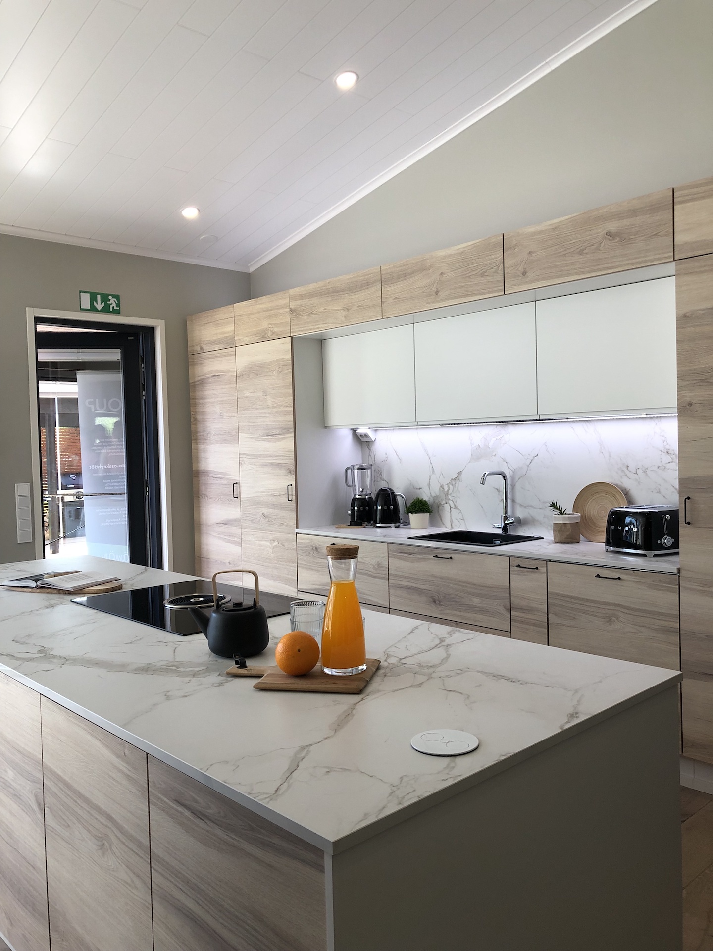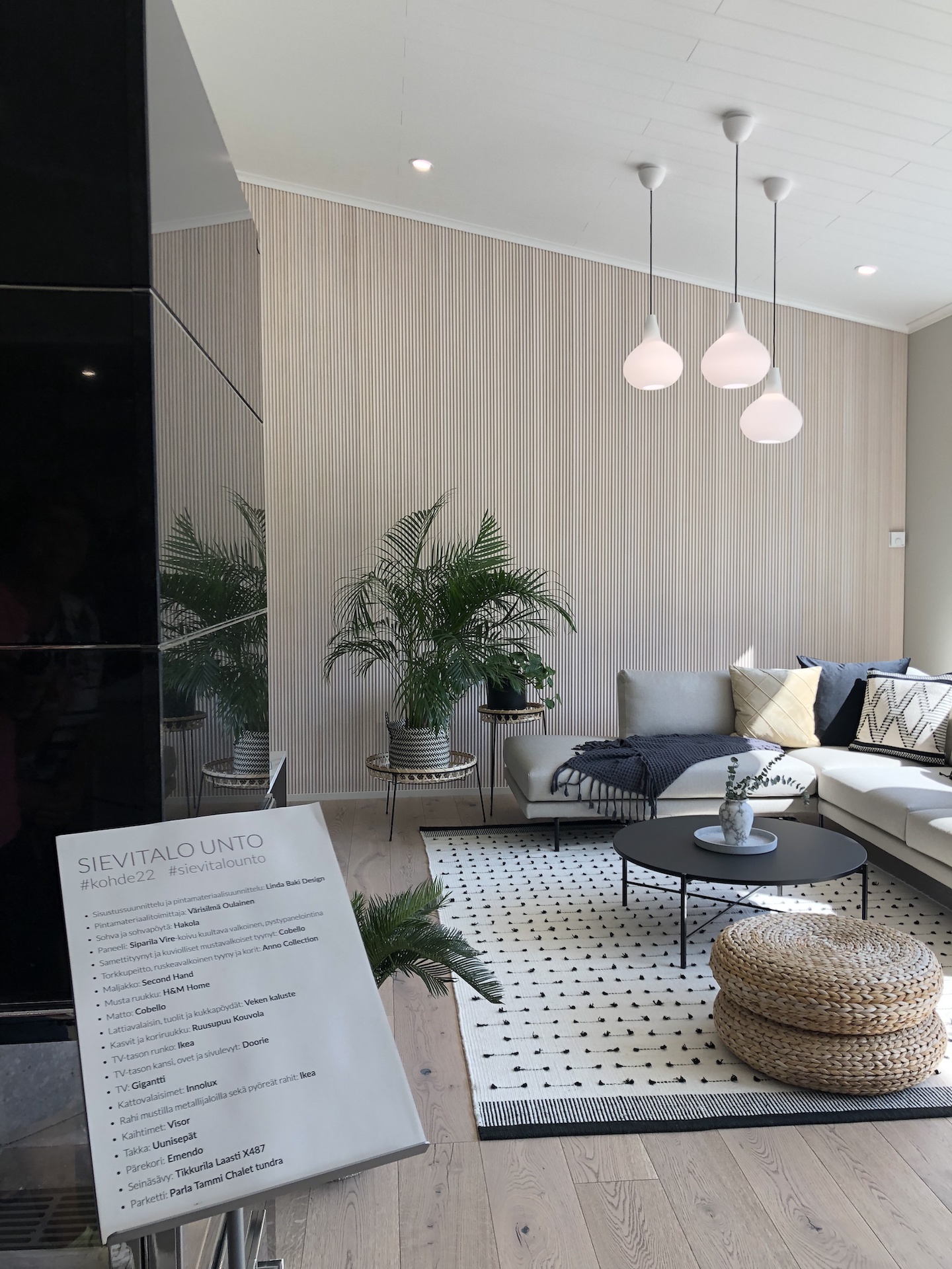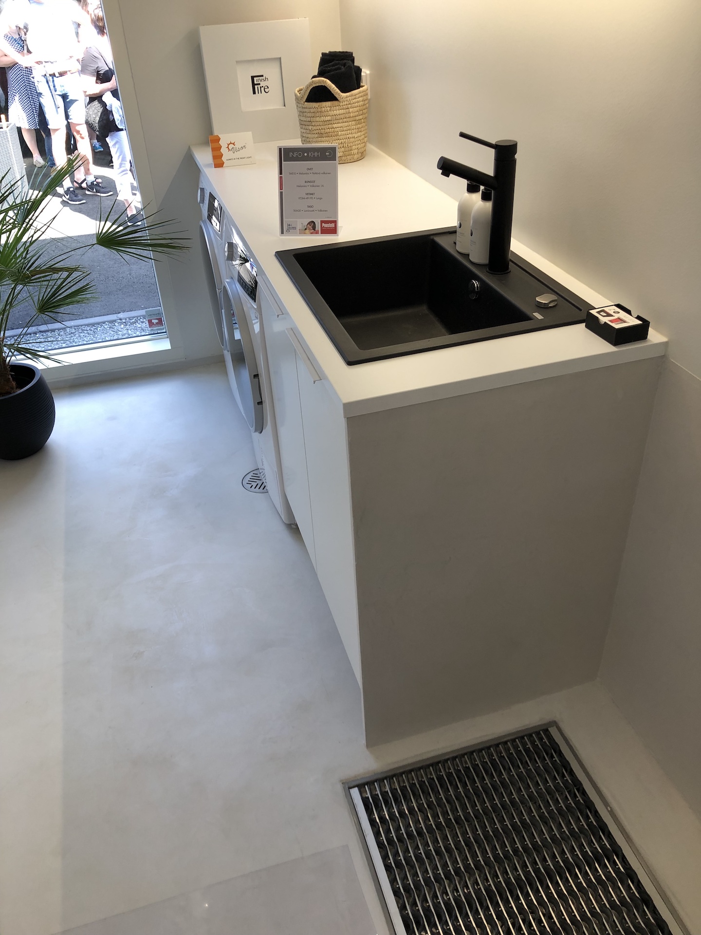 Pyöreät peilit johdattivat messuvieraat eteisestä WC-tilan kautta olohuoneeseen ja avokeittiöön. WC-tilan ja olohuoneen seinissä oli tyylikäs rimoitus. Huomioitavaa on, että WC:n ja kylppärin altaat ovat puukomposiittia. Keittiö oli yksi tyylikkäimmistä.