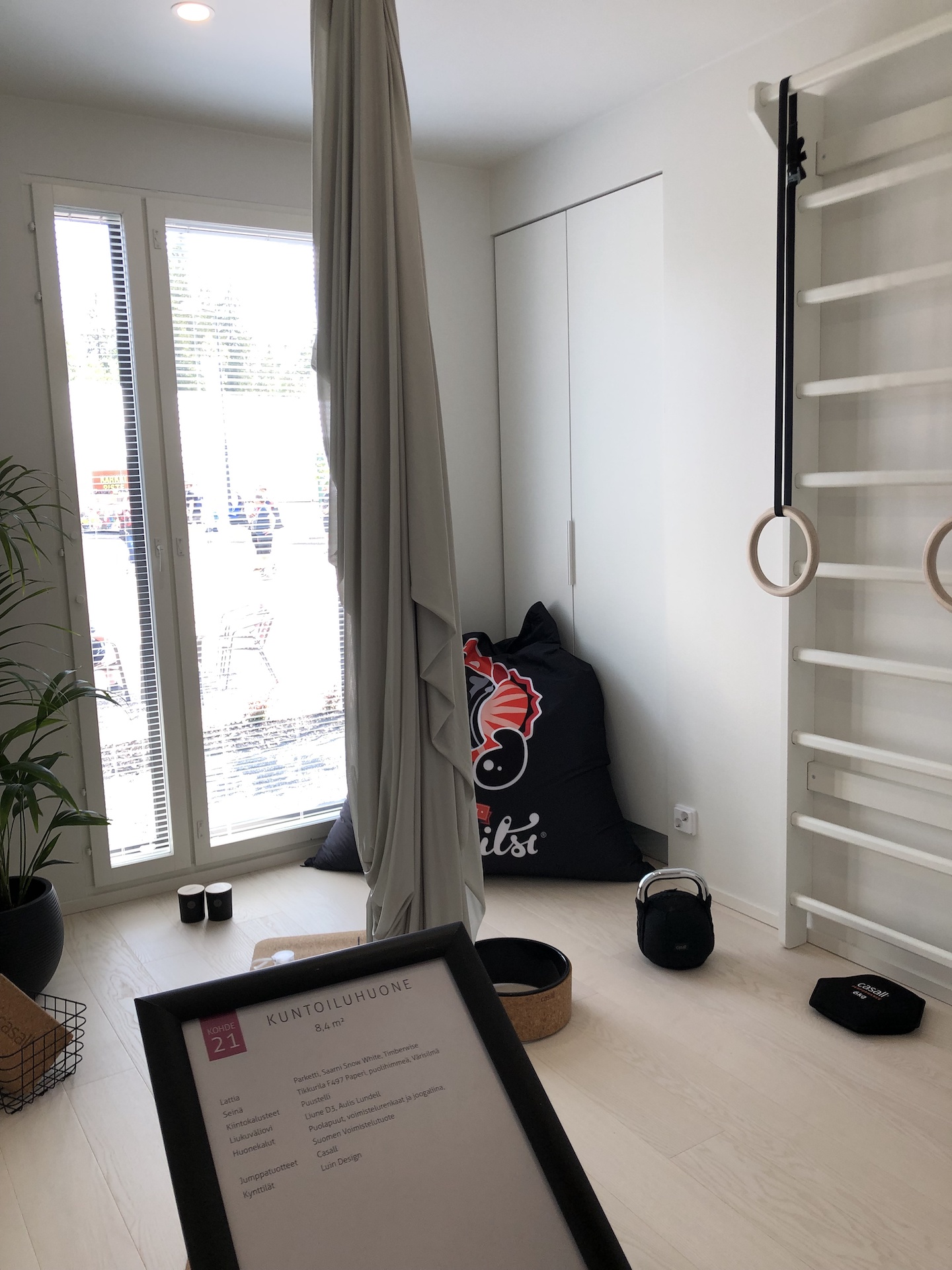 Paljon liikkuvalle ihmiselle yhden huoneen pyhittäminen kuntoiluun oli mieluinen ratkaisu. Puolapuut ja ilmajoogakangas tuovat liikettä asukkaille. Voi tosin miettiä, miten hyvin parketti toimii kahvakuulien kanssa.