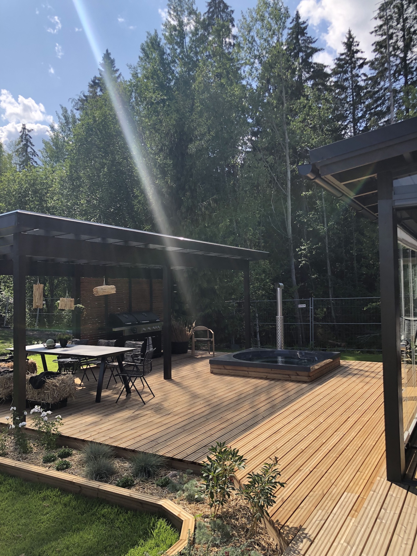 Sauna oli tässäkin muuten tyylikkäässä kohteessa toteutettu perinteikkäästi, ilman suurempaa designia. Kiuas oli aika erikoisen näköinen metalliputkihässäkkä valkoisine kivineen. Suihkutilassa viemäri oli piilotettu lattianrakoon. Lasitetun terassin lisäksi patiolta löytyi pisaran mallinen poreamme ja grillauskatos. Ehkä yksi viimeistellympiä piha-alueita.