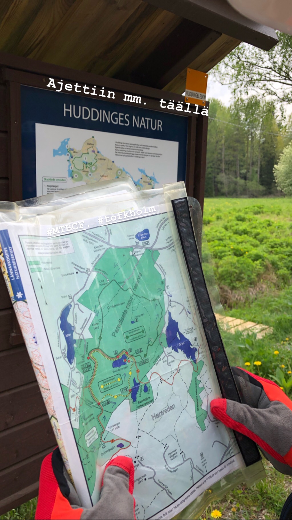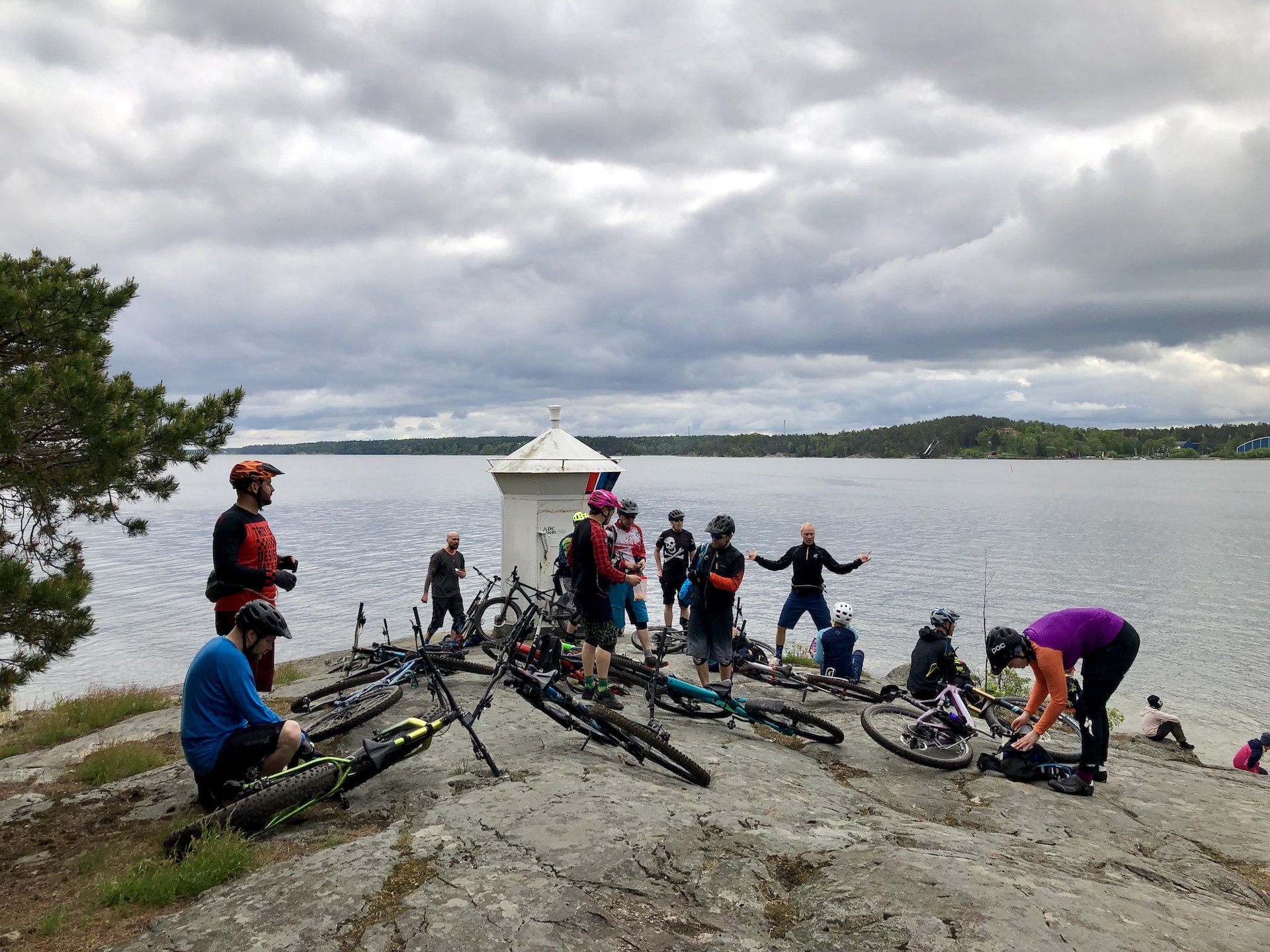 Valitsin lappeenrantalaisen Tomin vetämän ryhmän, joka suuntasi itselle uusille poluille Lämnaskogeniin ja Paradisetiin lyhyen junamatkan avustamana. Kun viime vuonna sää oli aurinkoinen ja lämmin, oli tämän reissun teema koleahko ja sateen uhkan sävyttämä. Lähtöpisteemme oli Trångsund, josta 12 ajajan ryhmänä suuntasimme läheiseen Lämnaskogenin maastoihin.