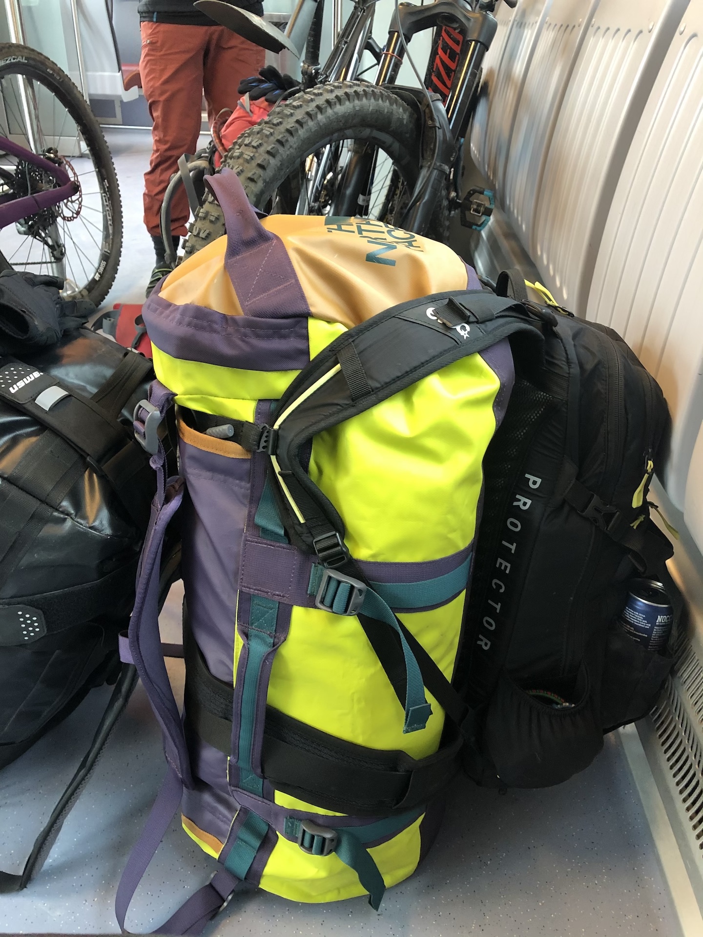 Ajon aikana tavarat ja kolmen litran juomasäiliö kulkivat kätevästi 16 litran Evoc FR Enduro Blackline -juomarepussa, johon mahtui hyvin eväät, varaosat, työkalut, pari vararengasta ja tuulelta / sateelta suojaava takki. Juomareppuni toimii myös kevyenä suojana, sillä siitä löytyy integroituna selkäpanssari. Olin lisäksi varustautunut kevyillä Specializedin Atlas-polvisuojilla. Matkatavarat pakkasin 71 litran North Face Duffel Bagiin, joka täyttyi ajovarusteista sopivasti ja sen päälle pystyi kätevästi köyttämään ajorepun siirtymien ajaksi.